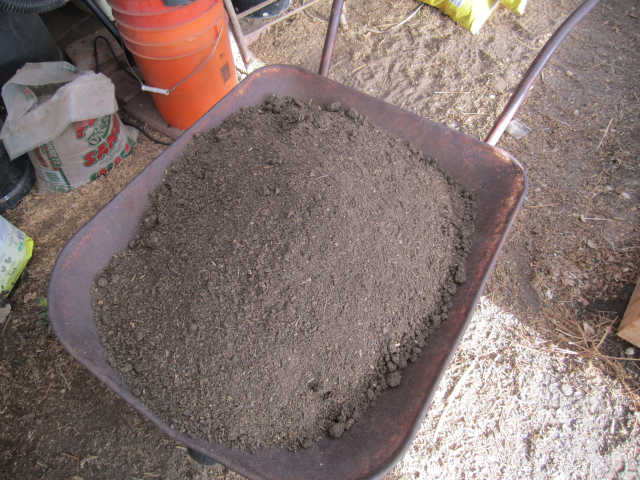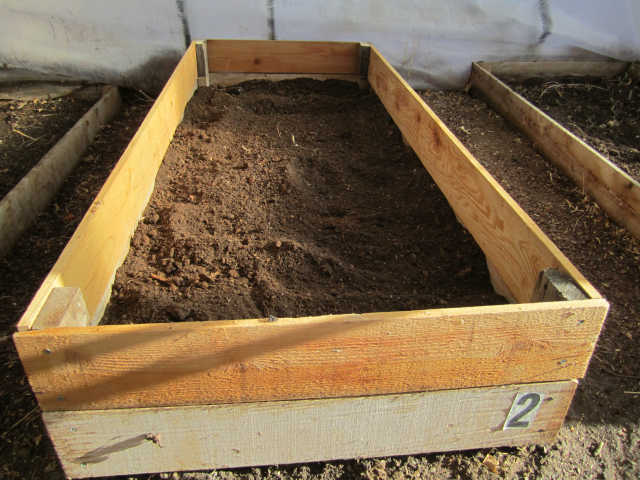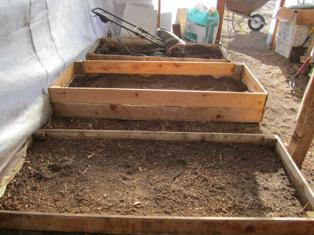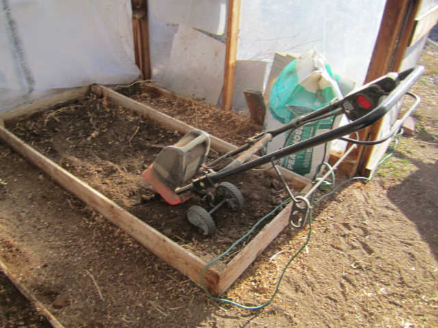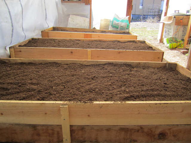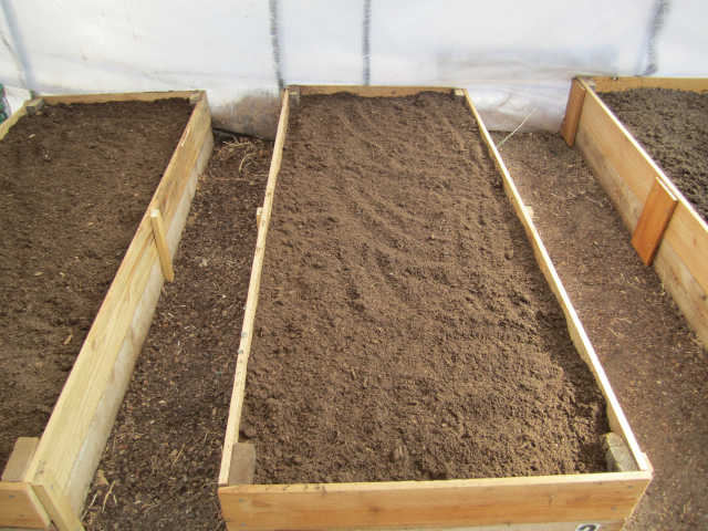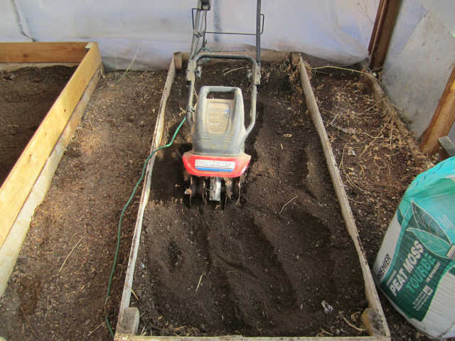 I added another tier to the boxes in the greenhouse giving me an additional 5 inch to the height, for a total of 10 inch depth and a surface of 18 square feet. The soil in the existing boxes was very compacted and hard so I added compost and peat moss to help prep the existing soil. I tilled the soil with an electric tiller. I add a combination of soil, compost, and peat moss in the ratio of 60/30/10 and mix thoroughly with the electric tiller. I add extra compost from a box I have in the chicken run, the girls prepare a very decent compost. I add a small amount of this compost to the surface to add live organisms back into the soil. In many places garden materials have been sterilized and are technically dead so you have to add something from a live source to repopulate the soil.The total amount of soil, peat, and composted required by the three boxes was 23 cubic feet, just shy of a cubic yard.